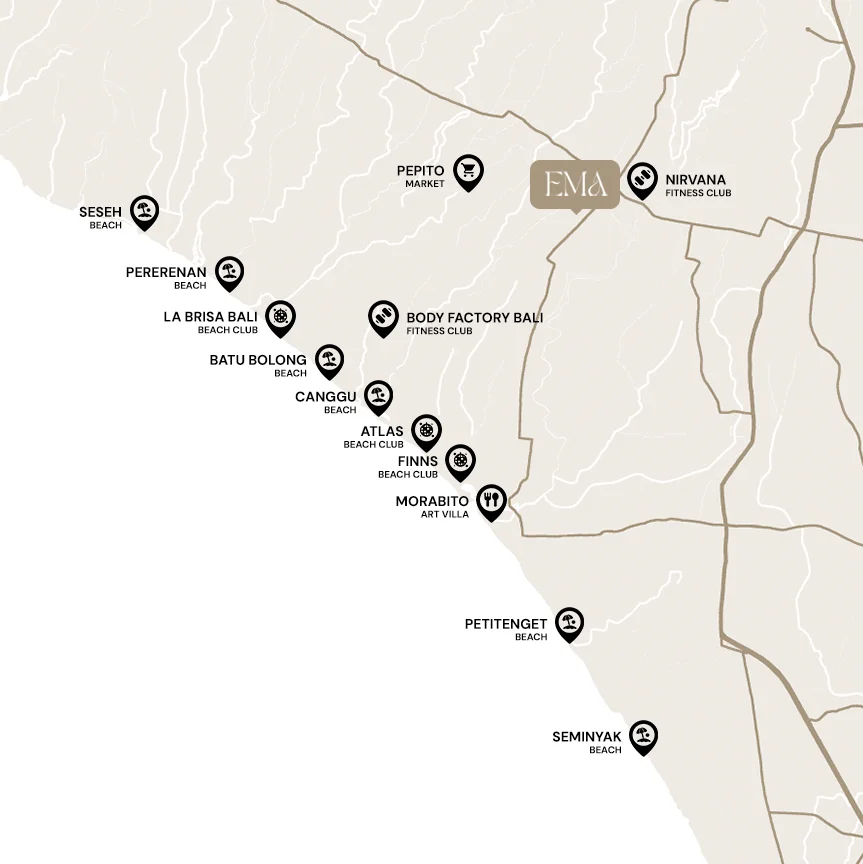 Welcome to EMA Villas, a truly premium destination nestled in the heart of Berawa, Bali. Our villas offer an unparalleled living experience with the best of Bali right at your doorstep. Located just minutes away from world-famous beaches, vibrant entertainment, and essential amenities, EMA Villas ensures that everything you need is within easy reach.